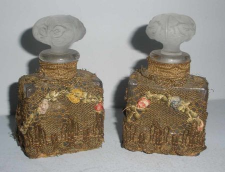Pair of frosted perfume bottles with lace wrapped around them with fabric flowers - 2" by 1" by 3" Pair of frosted perfume bottles with lace wrapped around them with fabric flowers - 2" by 1" by 3"