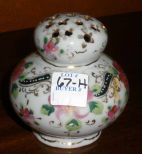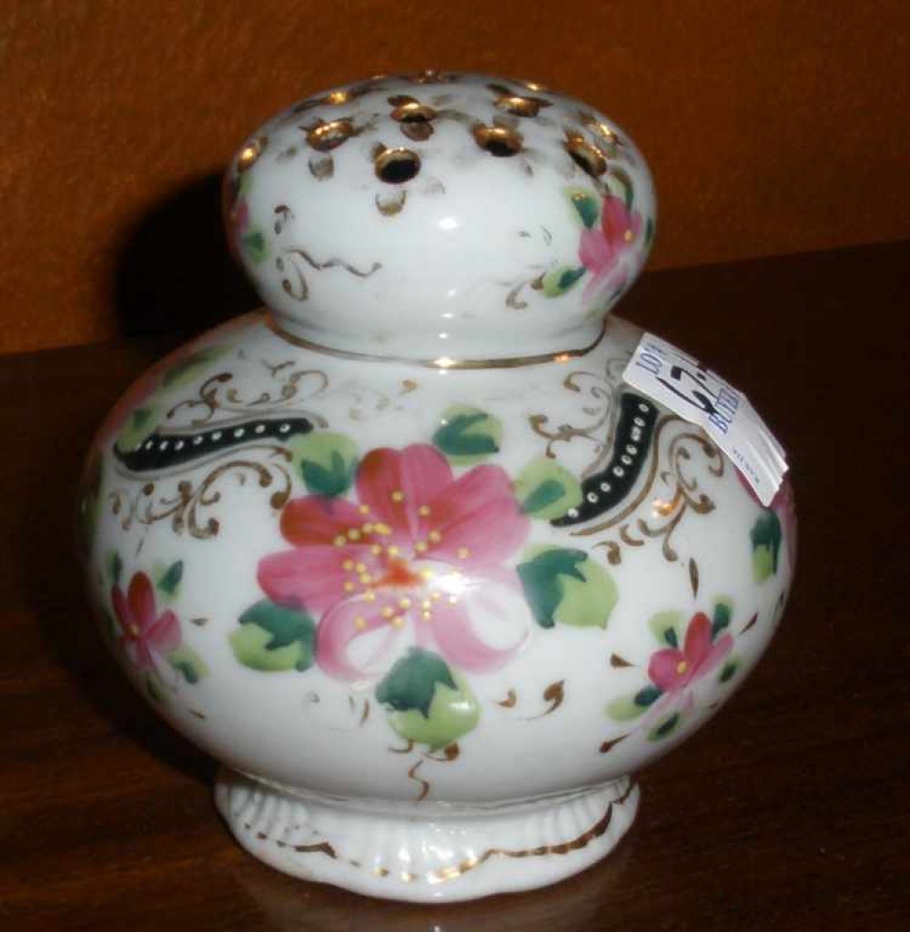 Blue & gold trim with pink flowers sugar shaker - 4" round by 4" tall Blue & gold trim with pink flowers sugar shaker - 4" round by 4" tall