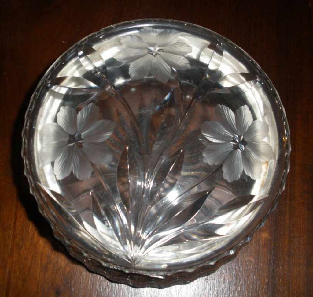 Cut glass hinged box, floral intaglio cut, silver plate fittings - 6" round by 3" tall Cut glass hinged box, floral intaglio cut, silver plate fittings - 6" round by 3" tall
