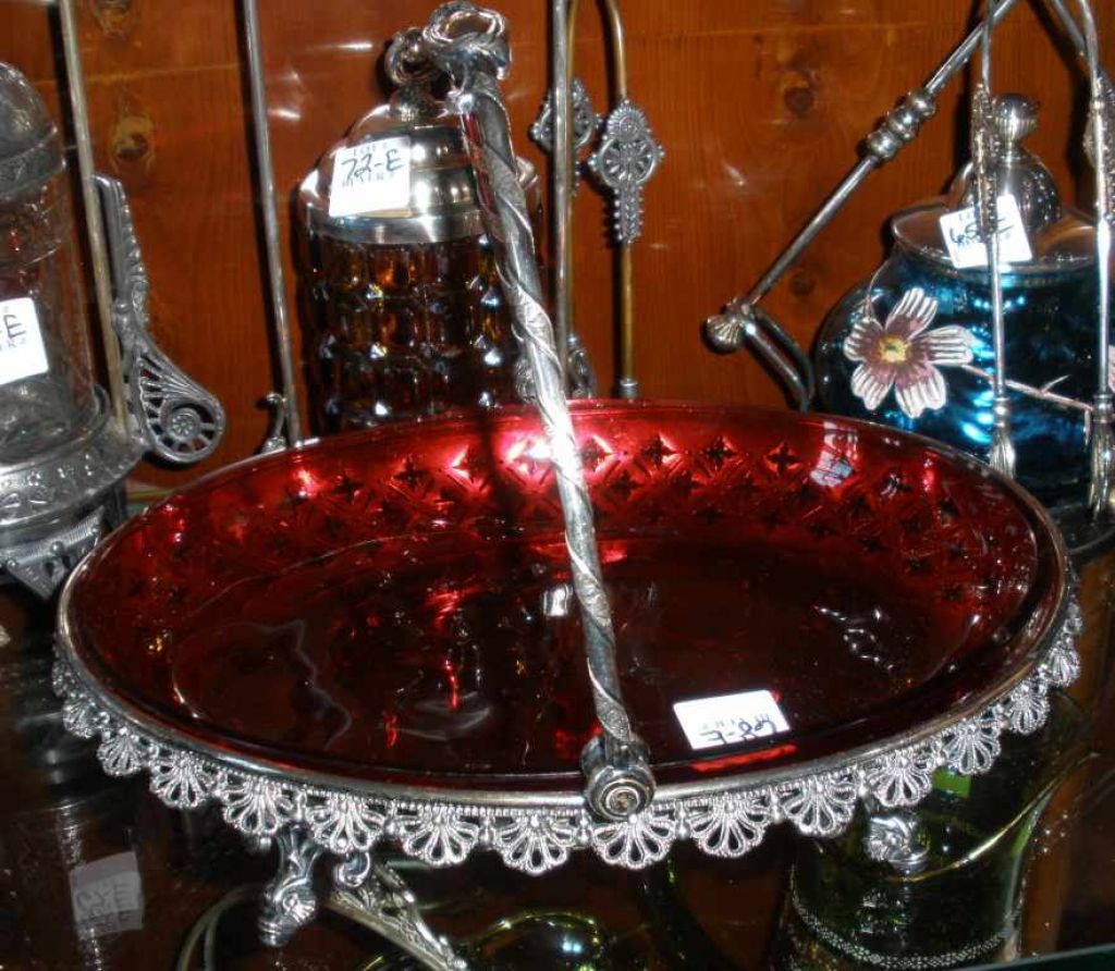 Ornate silver plate Victorian oval frame center bowl. Insert is ruby colored. 11" length x 9" width x 9" height Ornate silver plate Victorian oval frame center bowl. Insert is ruby colored. 11" length x 9" width x 9" height