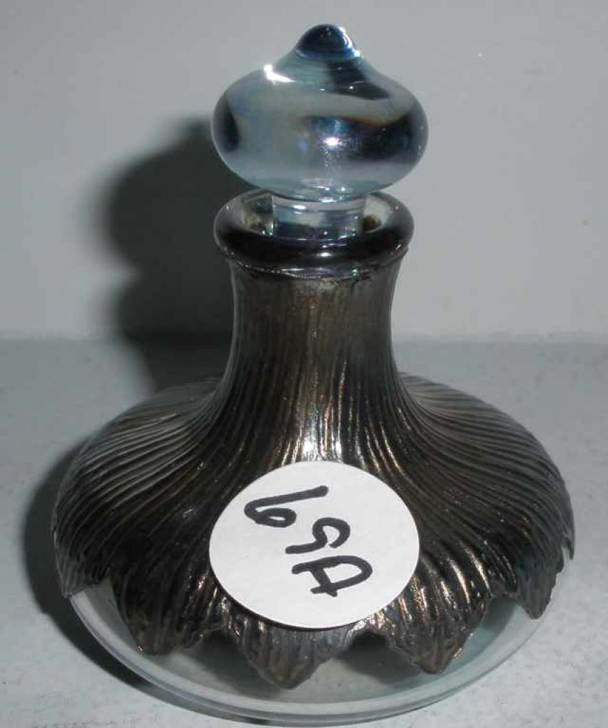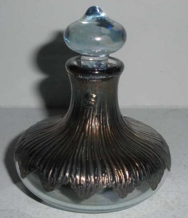 Purple small perfume bottle with silver applied - 2" round by 2 1/2" tall Purple small perfume bottle with silver applied - 2" round by 2 1/2" tall
