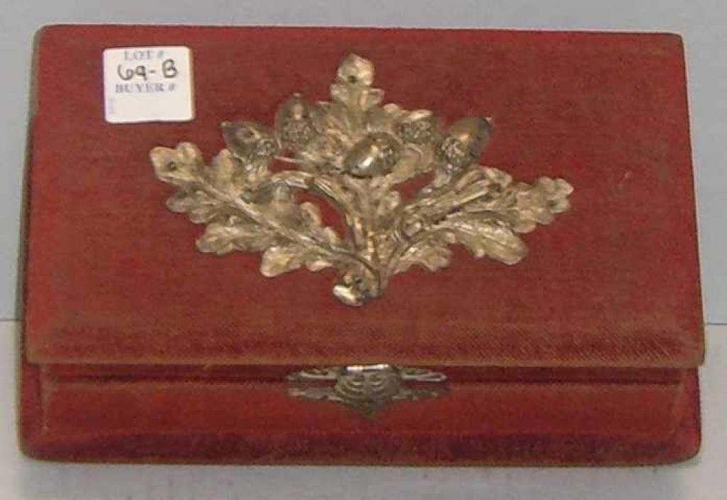 Victorian Pipe Box, Red Velvet w/Applied Silver Plate Acorns. 4 7/8" width x 8 1/4" length x 2 7/8" height Victorian Pipe Box, Red Velvet w/Applied Silver Plate Acorns. 4 7/8" width x 8 1/4" length x 2 7/8" height
