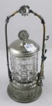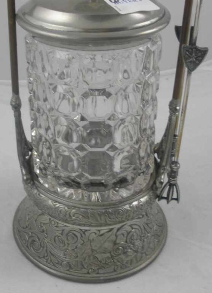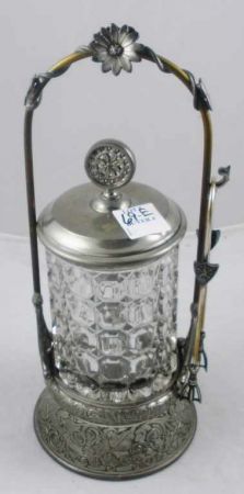 Wilcox Co. pickle castor with clear bubble insert & tongs. 4 1/2" round x 11 1/2" tall Wilcox Co. pickle castor with clear bubble insert & tongs. 4 1/2" round x 11 1/2" tall