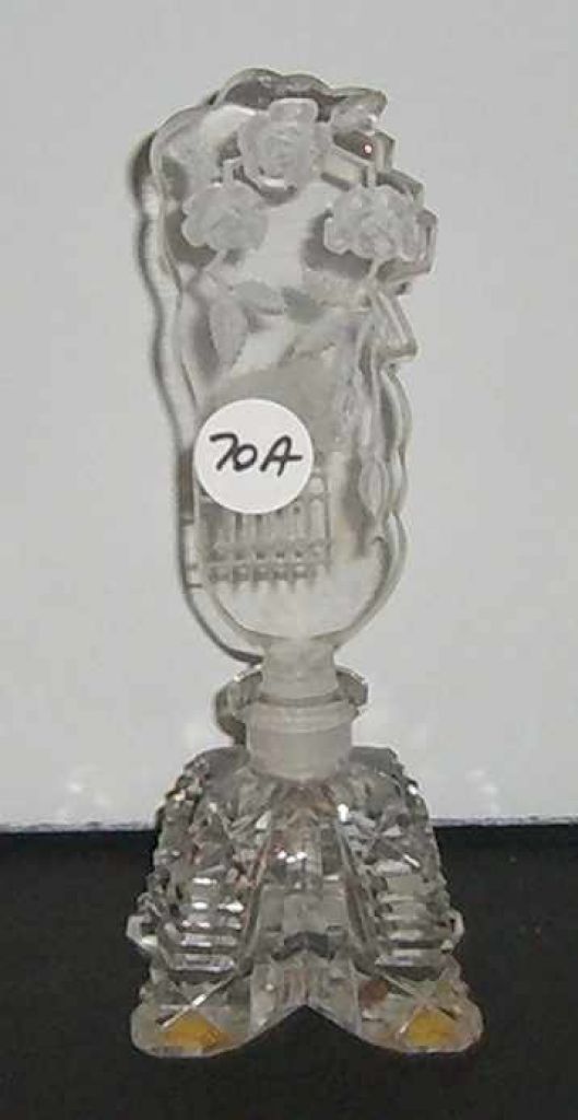 Clear Czech perfume bottle flat stopper with roses - 2 1/4" square by 6" tall Clear Czech perfume bottle flat stopper with roses - 2 1/4" square by 6" tall