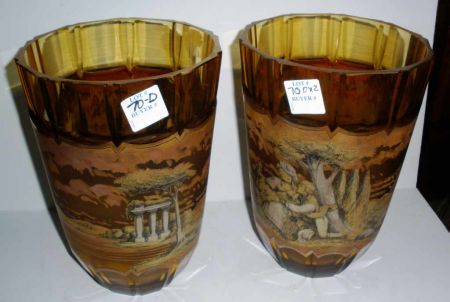 Pair of amber glass vases black & white courtship scene - 6" round by 8" tall Pair of amber glass vases black & white courtship scene - 6" round by 8" tall