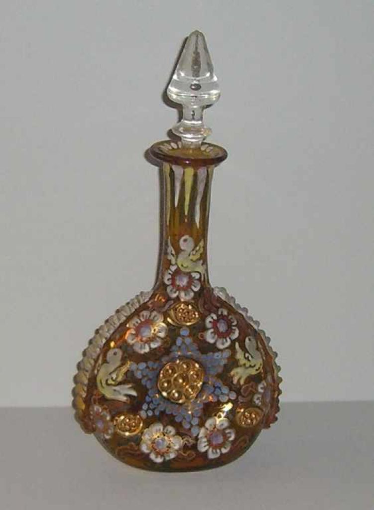 Moser gold trimmed decanter with birds - 5 1/2 inches wide by 12 inches tall Moser gold trimmed decanter with birds - 5 1/2 inches wide by 12 inches tall