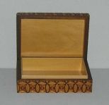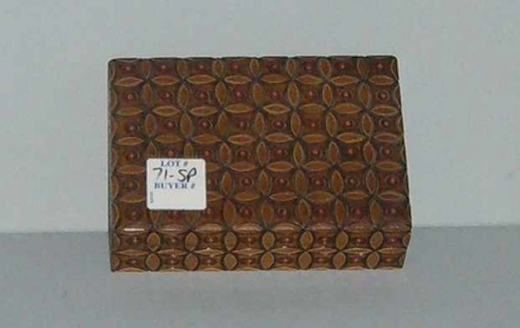 Small wood hinged box with carved designs - 5" length by 3 1/2" width by 1 1/2" deep Small wood hinged box with carved designs - 5" length by 3 1/2" width by 1 1/2" deep