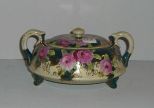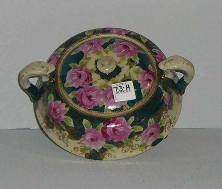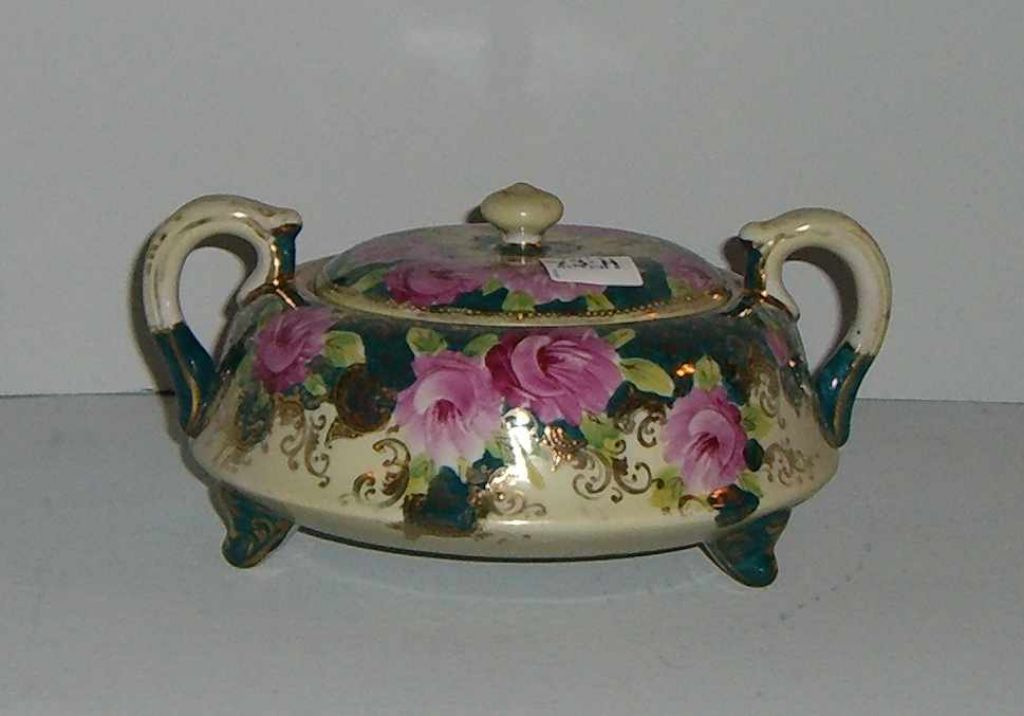 Covered 3 footed dish with gold beading & pink flowers with green background - 7" round by 4" tall Covered 3 footed dish with gold beading & pink flowers with green background - 7" round by 4" tall