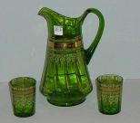 Victorian green pitcher & 2 glasses with gold & white enamel - Pitcher is 11" tall. Victorian green pitcher & 2 glasses with gold & white enamel - Pitcher is 11" tall.