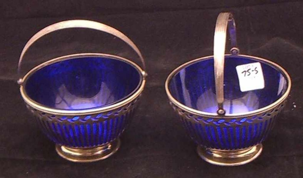 Pair Tiffany & Co. sterling silver handled baskets w/cobalt inserts Pair Tiffany & Co. sterling silver handled baskets w/cobalt inserts