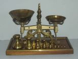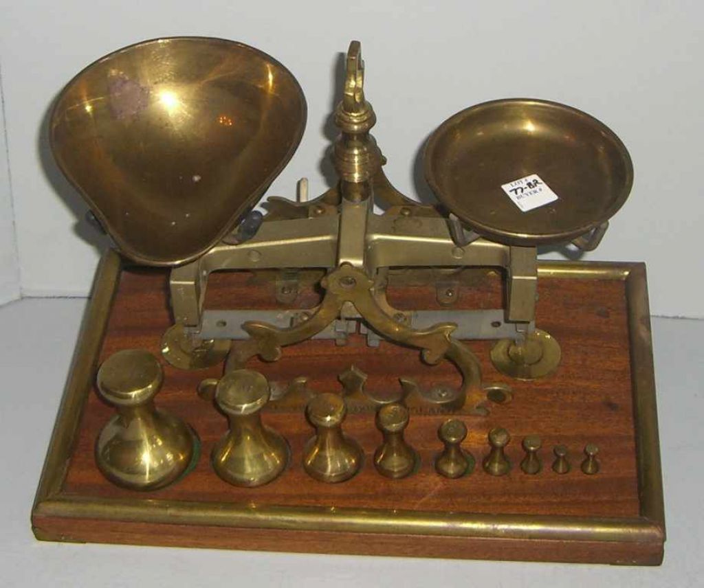 Set of British scales brass with solid brass weights Stevens England. 15" length x 9" width x 11" height Set of British scales brass with solid brass weights Stevens England. 15" length x 9" width x 11" height