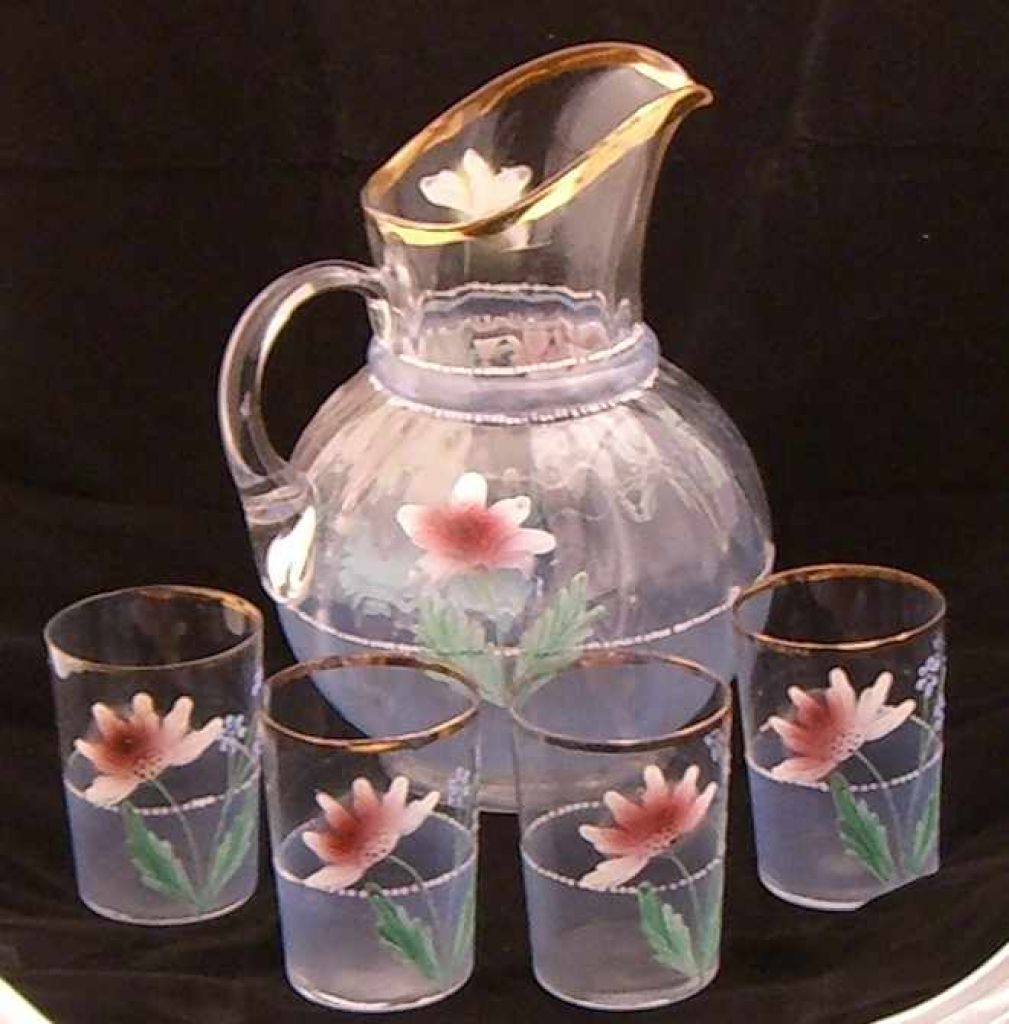 5 pc clear water set with blue satin trim & enameled flowers. Pitcher & 4 glasses. 5 pc clear water set with blue satin trim & enameled flowers. Pitcher & 4 glasses.