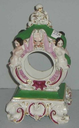 Old Paris hand painted table top clock frame with no clock, nude ladies on corners with mans face above clock hole - 7" length x 7" width x 12" height Old Paris hand painted table top clock frame with no clock, nude ladies on corners with mans face above clock hole - 7" length x 7" width x 12" height