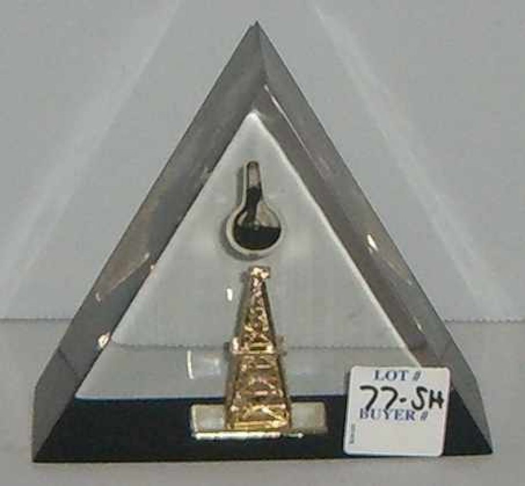 Triangle clear paper weight with oil derrick & drop of oil Triangle clear paper weight with oil derrick & drop of oil