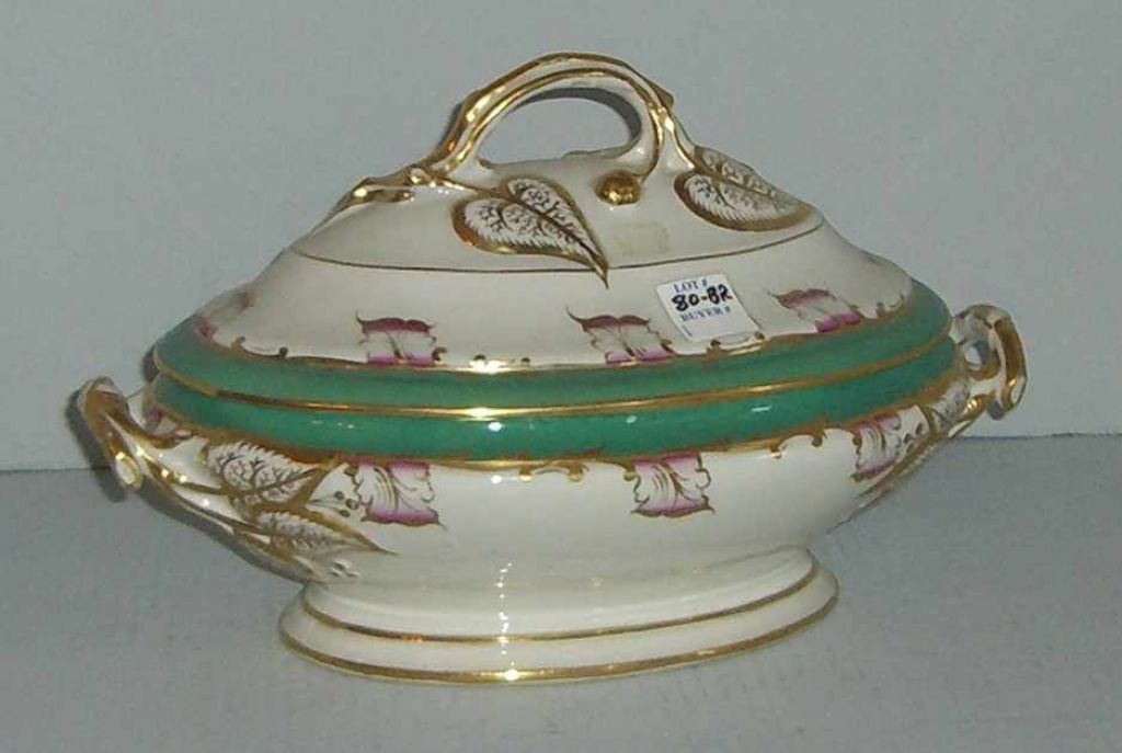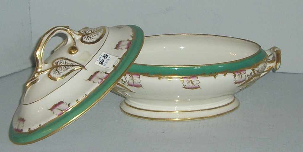 Old Paris style oval covered tureen green & gold. 12" length x 7" width x 8" height Old Paris style oval covered tureen green & gold. 12" length x 7" width x 8" height