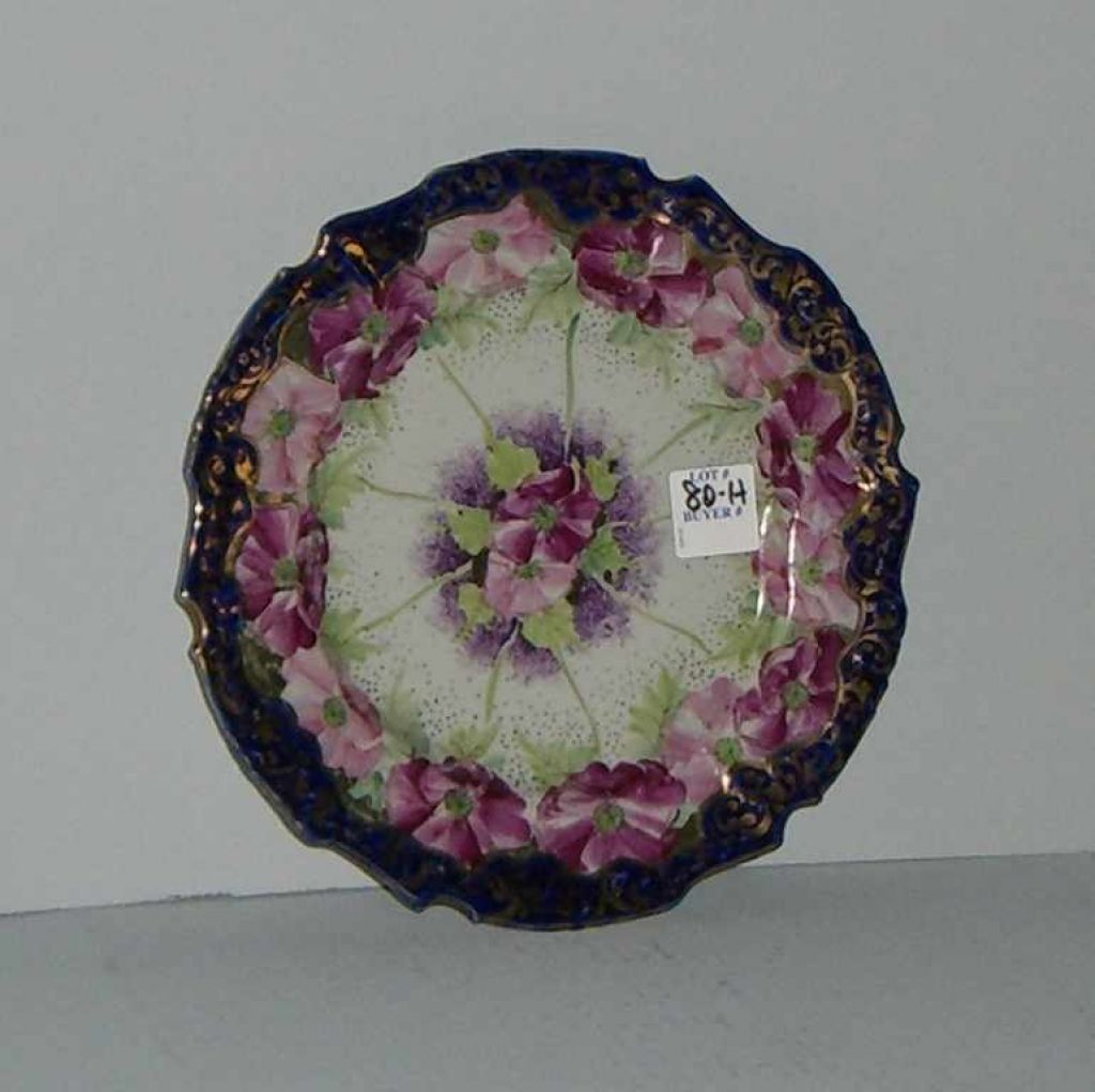 Blue & gold trimmed plate with 2 tone pink flowers - 9" round Blue & gold trimmed plate with 2 tone pink flowers - 9" round