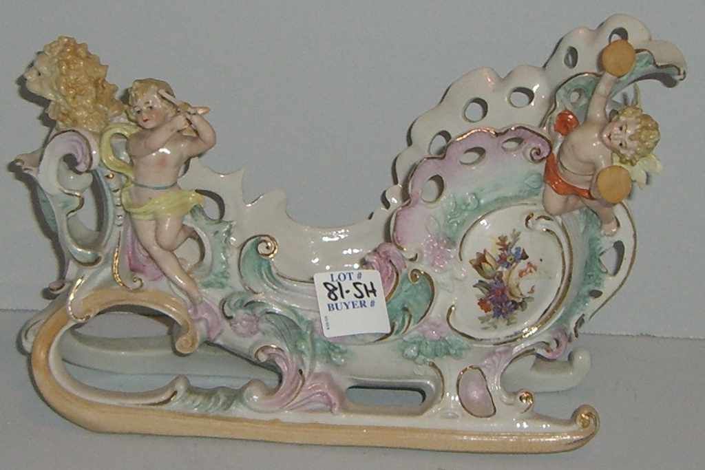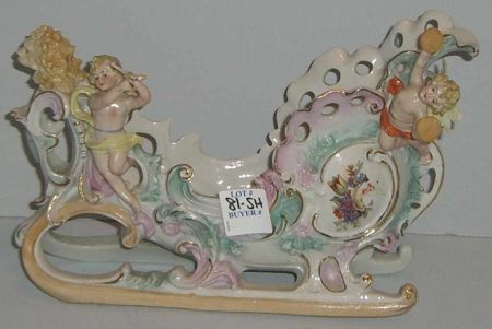 Ornate planter in sled design with musical cherubs & lion head - 10" wide by 4" deep by 7" tall Ornate planter in sled design with musical cherubs & lion head - 10" wide by 4" deep by 7" tall