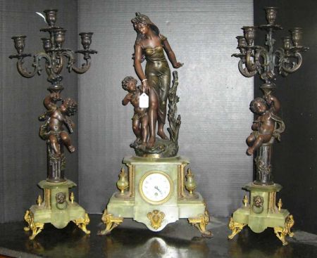 1207 French 3 Piece Bronze w/Onic Vase, Clock Set by B. Rouchon