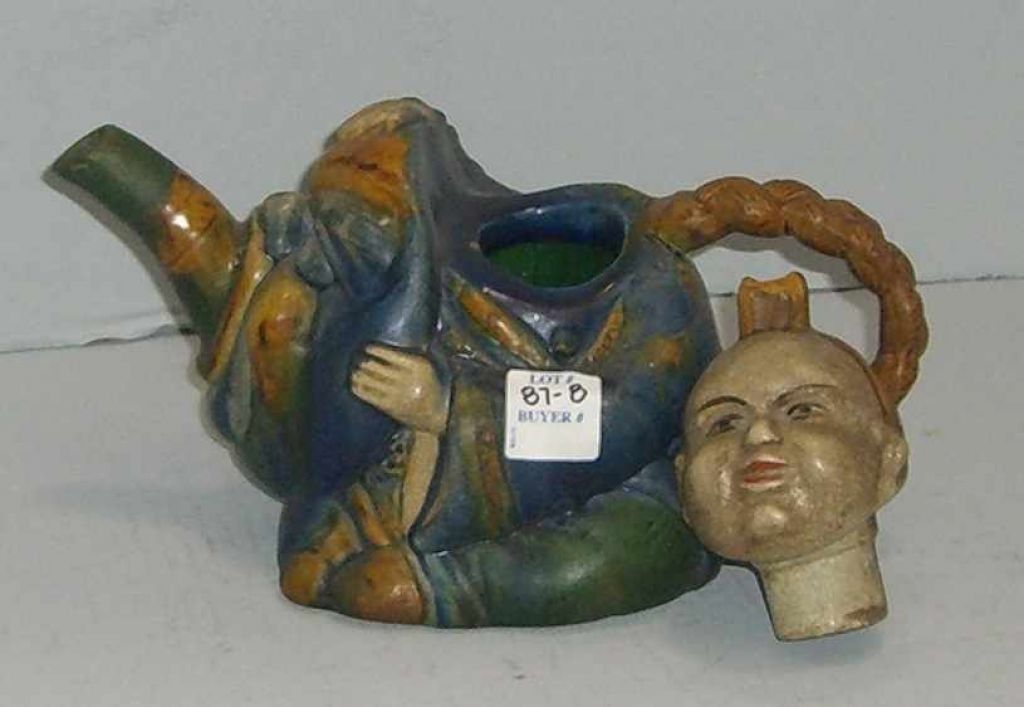 Majolica Tea Pot "Mantern" Oriental Man the Head Stopper. 4 1/2" width x 9" length x 7" height Majolica Tea Pot "Mantern" Oriental Man the Head Stopper. 4 1/2" width x 9" length x 7" height