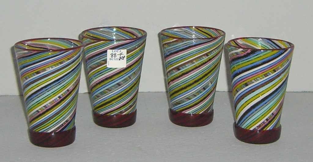 4 Multi-colored art glass Italian Murano glasses - 3 1/2" round by 5" tall 4 Multi-colored art glass Italian Murano glasses - 3 1/2" round by 5" tall