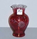 Cranberry & clear etched vase - 4" round by 6" tall Cranberry & clear etched vase - 4" round by 6" tall