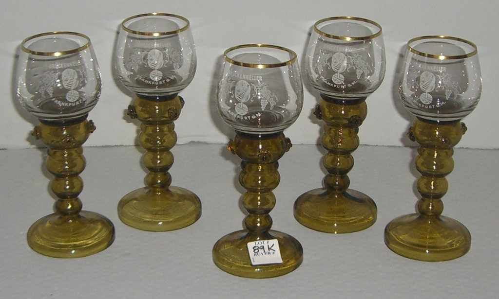 5 Amber based clear top glasses Bruckenkeller Frankfurt am - 3" round by 7" tall 5 Amber based clear top glasses Bruckenkeller Frankfurt am - 3" round by 7" tall