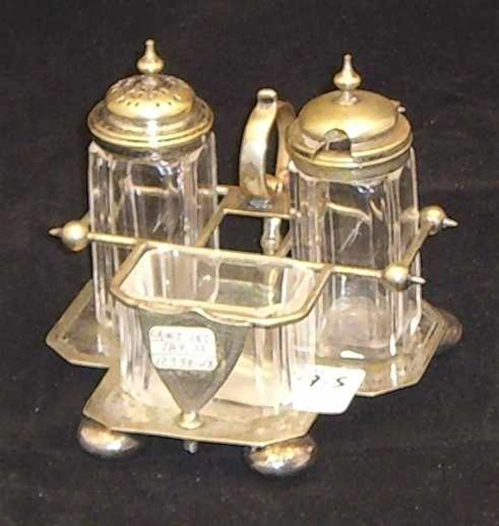 3 pc Cruet set in silver plate frame 3 pc Cruet set in silver plate frame