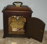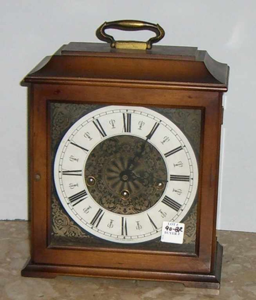Small bracket clock with ornate face Westminster chime Mahogany - 9 1/2" by 9 1/4" Small bracket clock with ornate face Westminster chime Mahogany - 9 1/2" by 9 1/4"