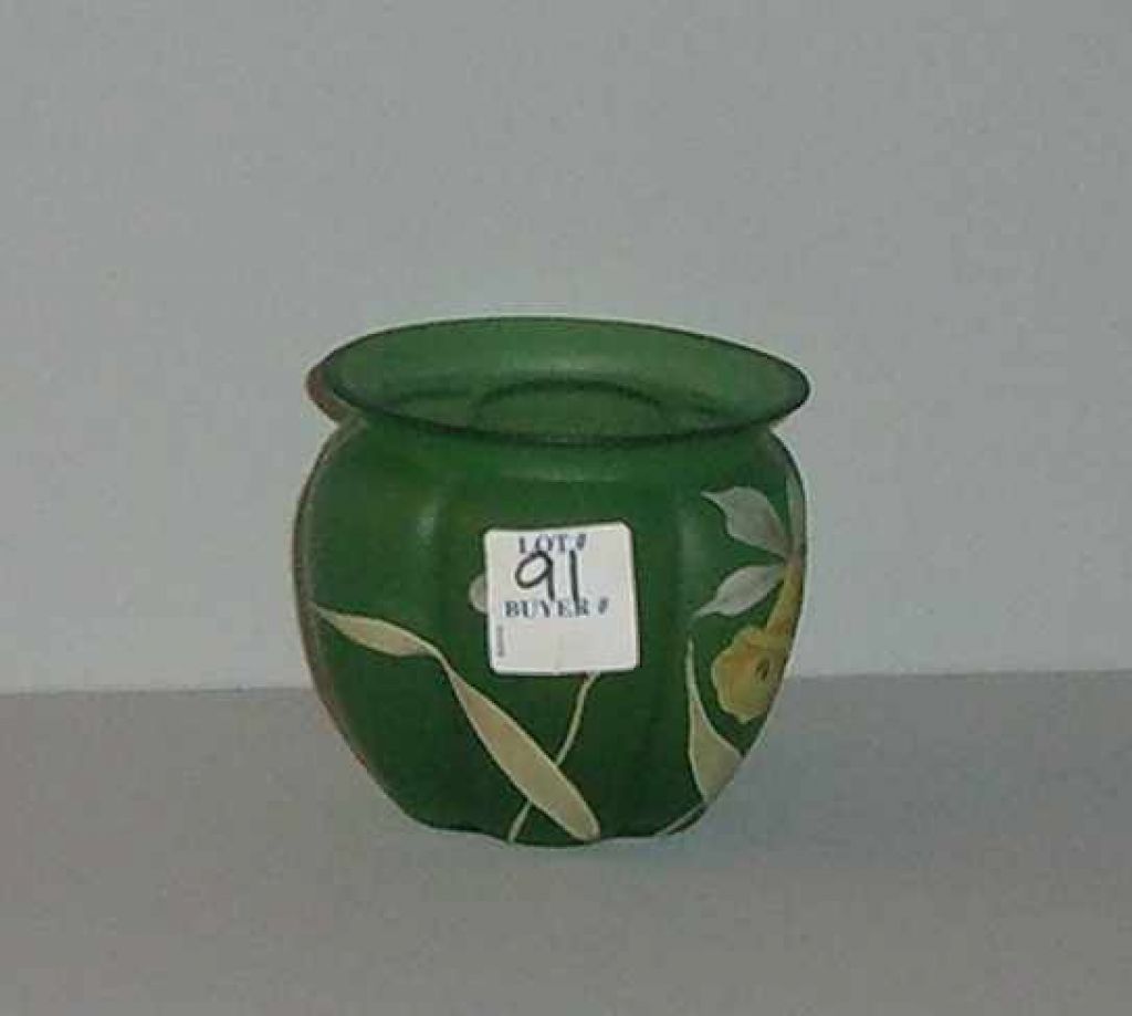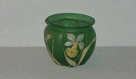 Small hand painted flower Loetz green bowl - 3 1/2" wide by 3" tall Small hand painted flower Loetz green bowl - 3 1/2" wide by 3" tall