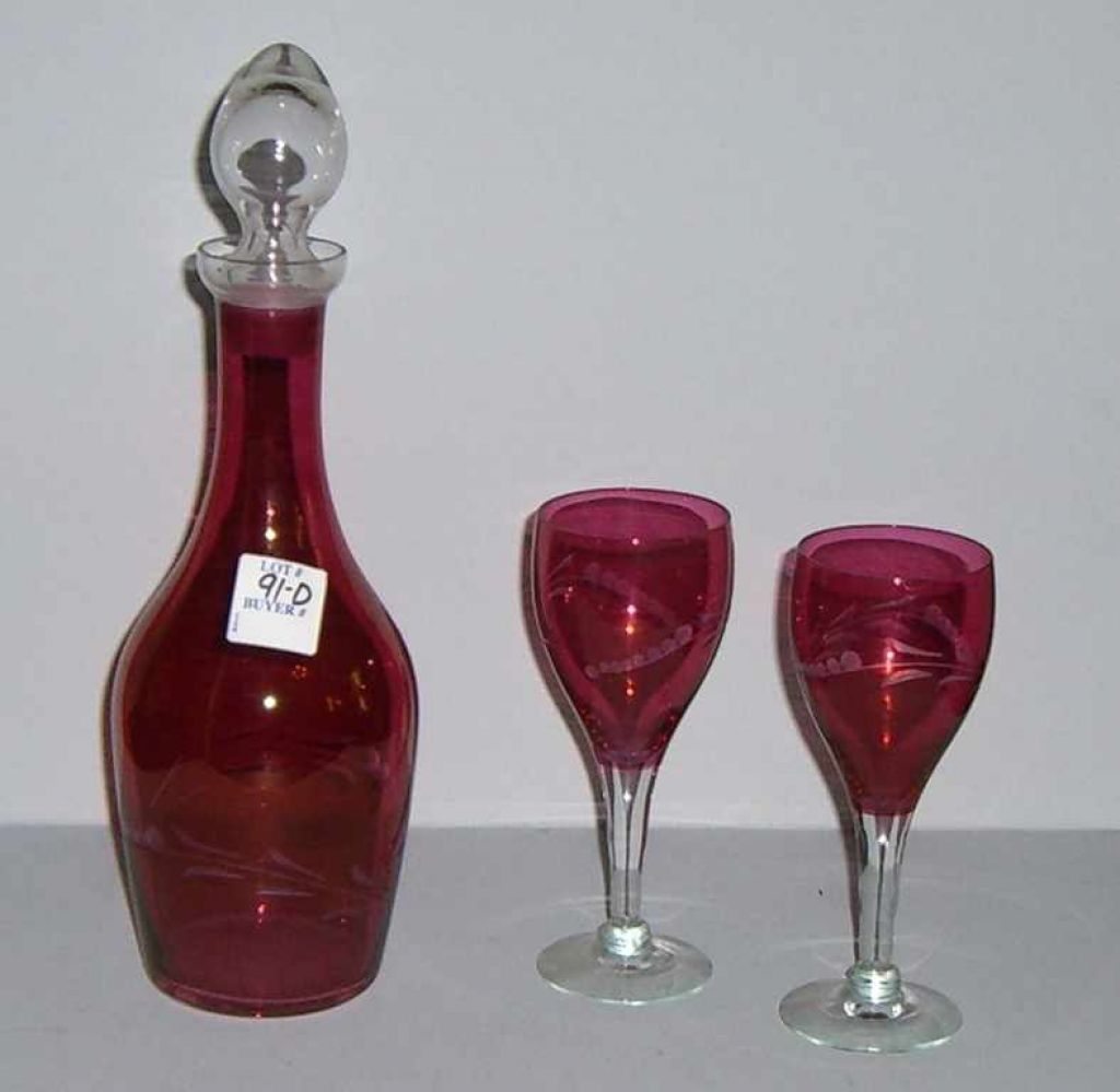 3 pc cranberry decanter & 2 stems - 3 1/2" round by 11" tall 3 pc cranberry decanter & 2 stems - 3 1/2" round by 11" tall