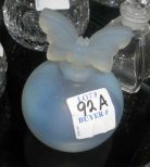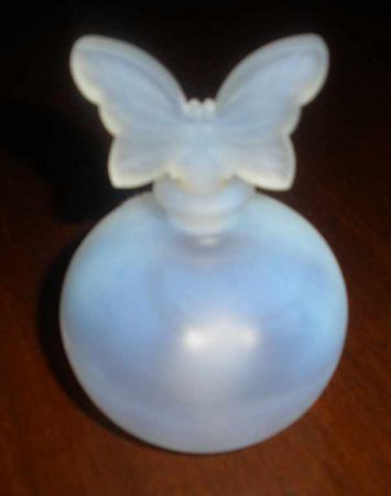Frosted French perfume bottle with butterfly stopper - 2 1/2" round by 3" tall Frosted French perfume bottle with butterfly stopper - 2 1/2" round by 3" tall