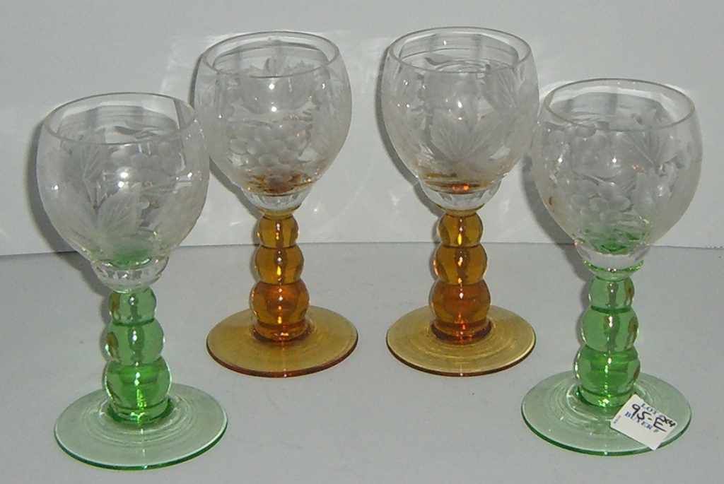 4 goblets with grape etched tops & colored stems, 2 green & 2 amber - 6 1/2" tall 4 goblets with grape etched tops & colored stems, 2 green & 2 amber - 6 1/2" tall