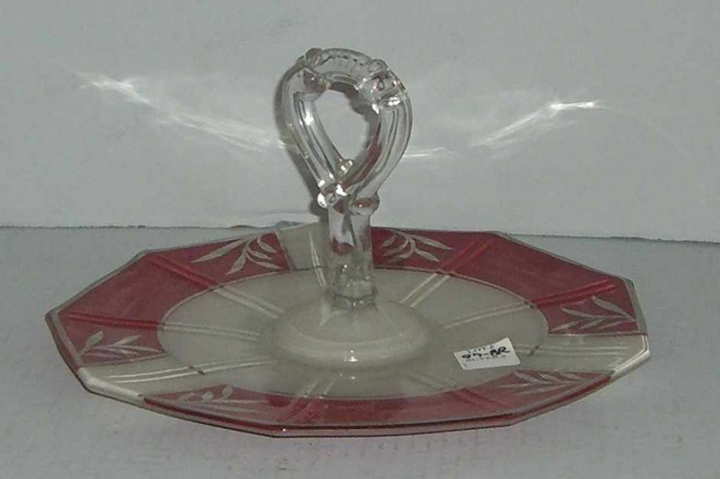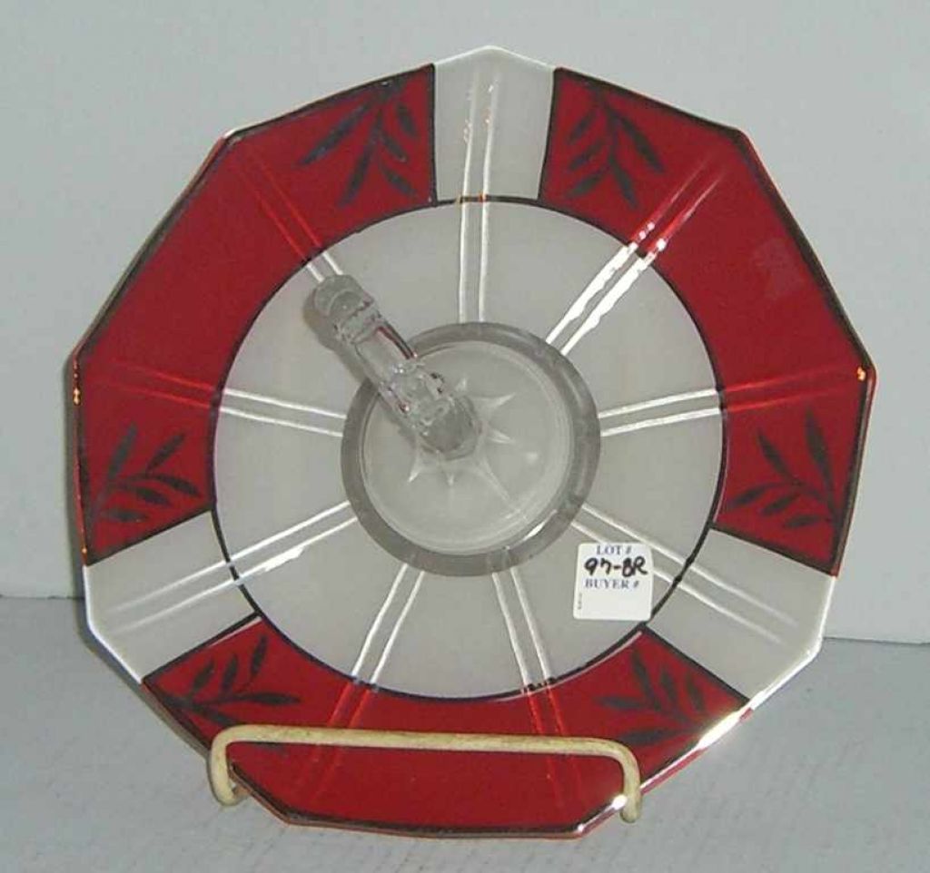 1359 Milk glass with red panel handled cracker server with sterling overlay