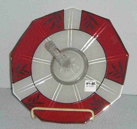 Milk glass with red panel handled cracker server with sterling overlay - 10 1/2" round Milk glass with red panel handled cracker server with sterling overlay - 10 1/2" round