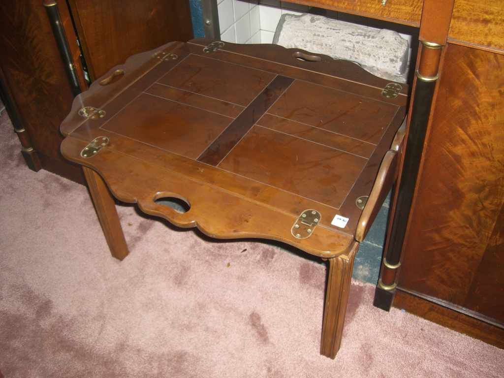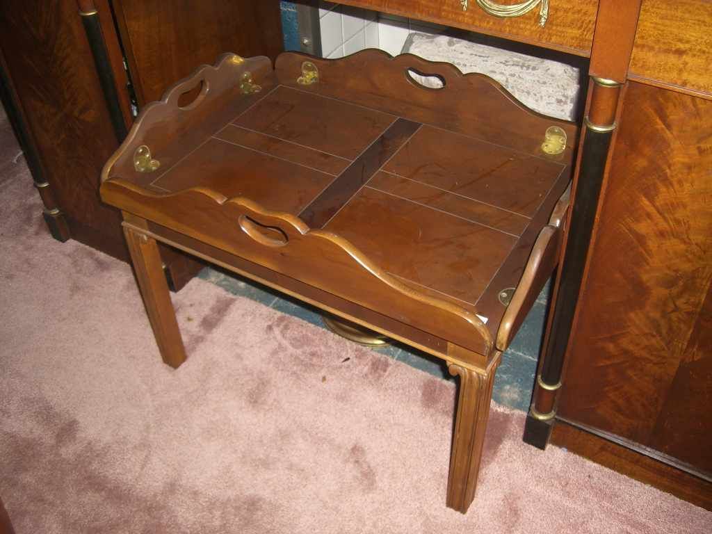 Baker Co. yew wood butlers or coffee table with drop sides - 18" tall by 36" long by 27 1/2" deep with sides dropped. Baker Co. yew wood butlers or coffee table with drop sides - 18" tall by 36" long by 27 1/2" deep with sides dropped.