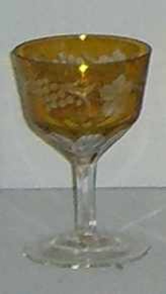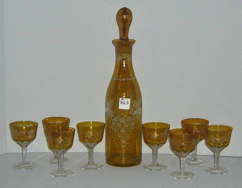 9 pc. amber bohemian cut to clear decanter set with etched grapes, decanter with 8 glasses. 9 pc. amber bohemian cut to clear decanter set with etched grapes, decanter with 8 glasses.