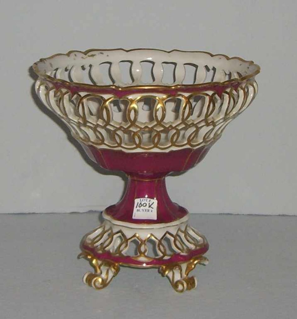 Old Paris reticulated center bowl on pedestal base red, gold, & white - 9" round by 9" tall Old Paris reticulated center bowl on pedestal base red, gold, & white - 9" round by 9" tall