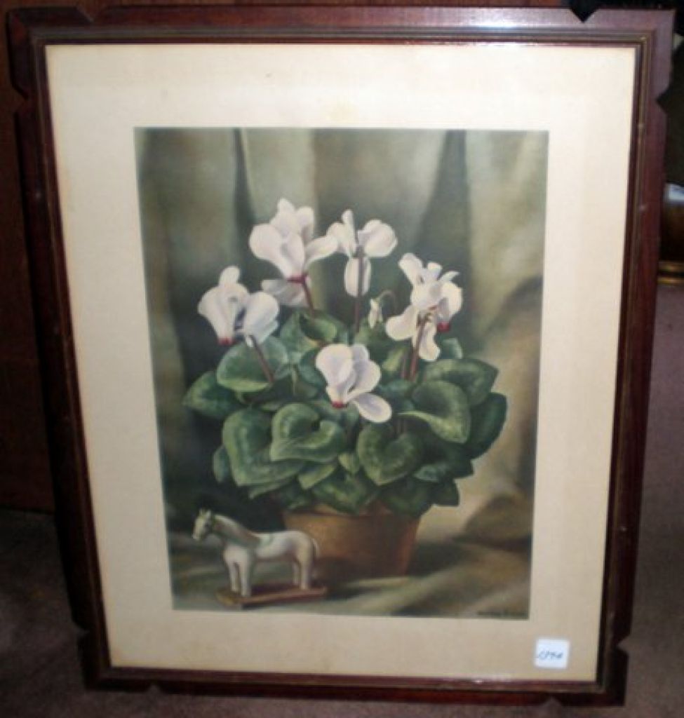 Framed picture of vase of flowers & toy wood horse Framed picture of vase of flowers & toy wood horse