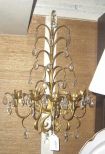 Pair of French gilded wall sconces with tear drop prisms. 5 candlestick holders - 24" tall by 18" wide. Pair of French gilded wall sconces with tear drop prisms. 5 candlestick holders - 24" tall by 18" wide.