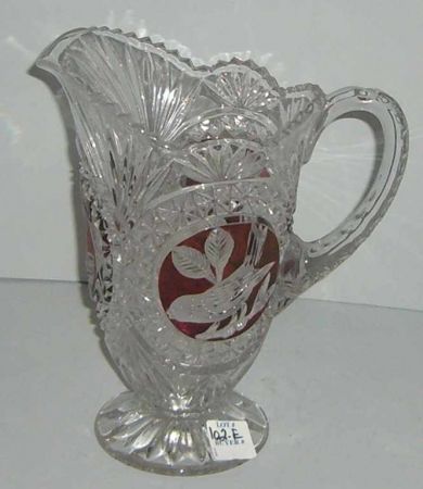 Cut bird glass pitcher with ruby cut to clear around bird - 9 1/2" tall Cut bird glass pitcher with ruby cut to clear around bird - 9 1/2" tall
