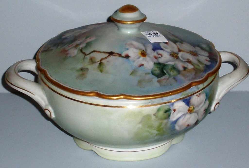 Hand painted white flowers Bavarian double handle vegetable footed dish. 9" round x 7" tall Hand painted white flowers Bavarian double handle vegetable footed dish. 9" round x 7" tall
