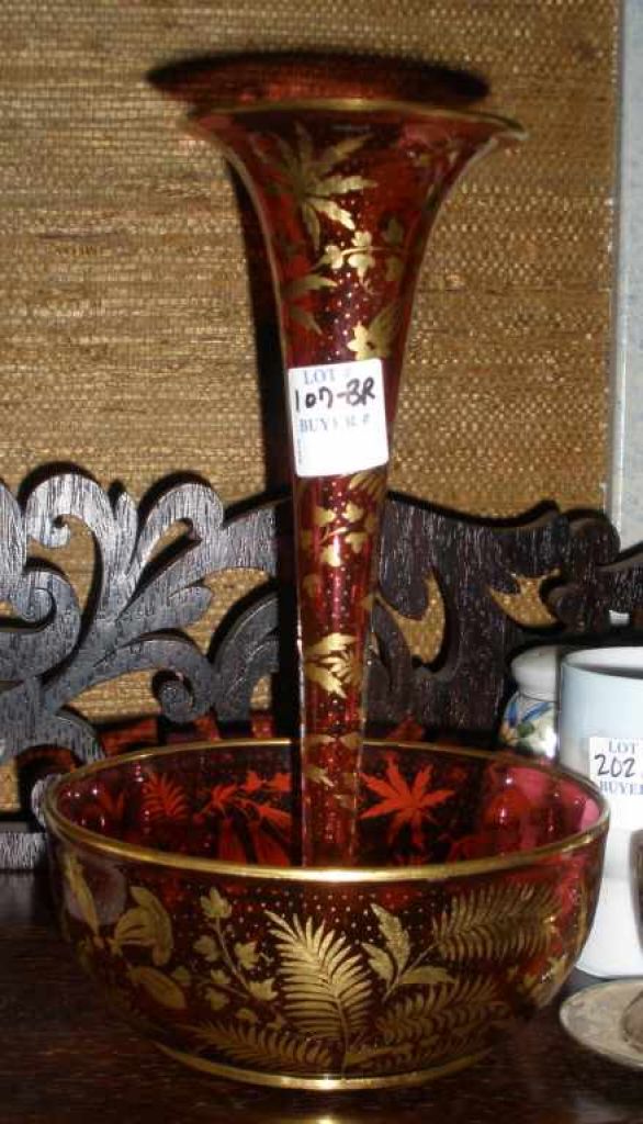 Cranberry with gold floral decorated single epergne - 9" tall Cranberry with gold floral decorated single epergne - 9" tall