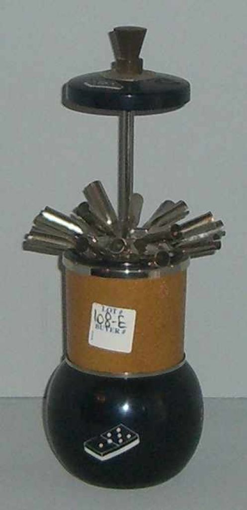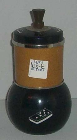 Black with brown leather band cigarette holder, decorated with dominoes - 3 1/2" round by 7" tall Black with brown leather band cigarette holder, decorated with dominoes - 3 1/2" round by 7" tall