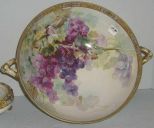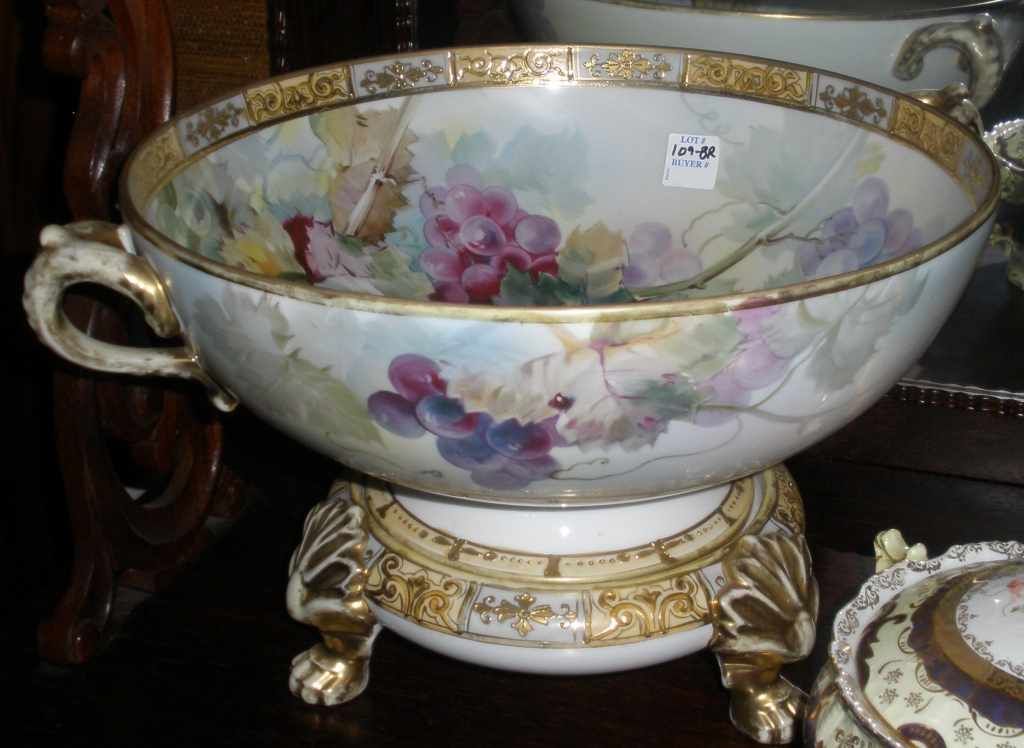 Handled 15" across Nippon punch bowl on footed stand with grape & foliage deco. Heavy gold gilt. Handled 15" across Nippon punch bowl on footed stand with grape & foliage deco. Heavy gold gilt.