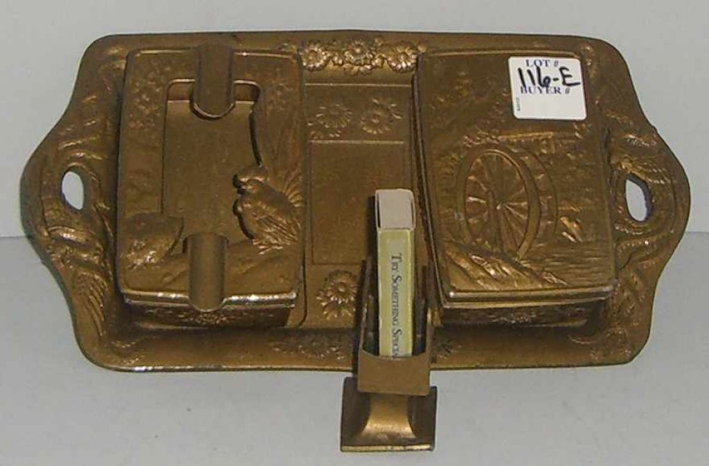 4 pc metal Occupied Japan cigarette set with bird designs, tray, ashtray, match holder, & cigarette box. 4 pc metal Occupied Japan cigarette set with bird designs, tray, ashtray, match holder, & cigarette box.