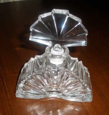 Clear fan shaped perfume bottle with fan shaped stopper - 5 1/2" tall Clear fan shaped perfume bottle with fan shaped stopper - 5 1/2" tall