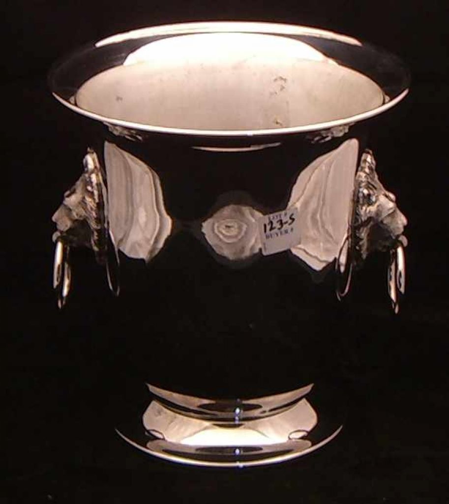 Silver plated wine cooler w/lion mask handles and underplate - Gorham Silver Plate - 9 1/2" tall 8 3/4" diameter Silver plated wine cooler w/lion mask handles and underplate - Gorham Silver Plate - 9 1/2" tall 8 3/4" diameter