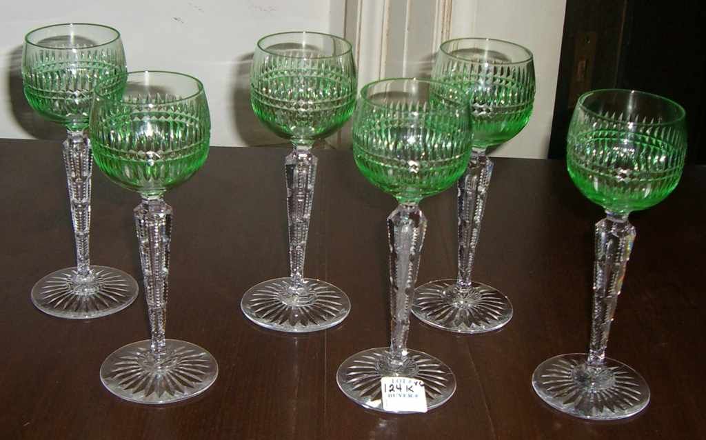 6 apple green cut stems with tear drop in center, Dorflinger Renaissance - 7" tall 6 apple green cut stems with tear drop in center, Dorflinger Renaissance - 7" tall