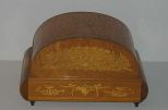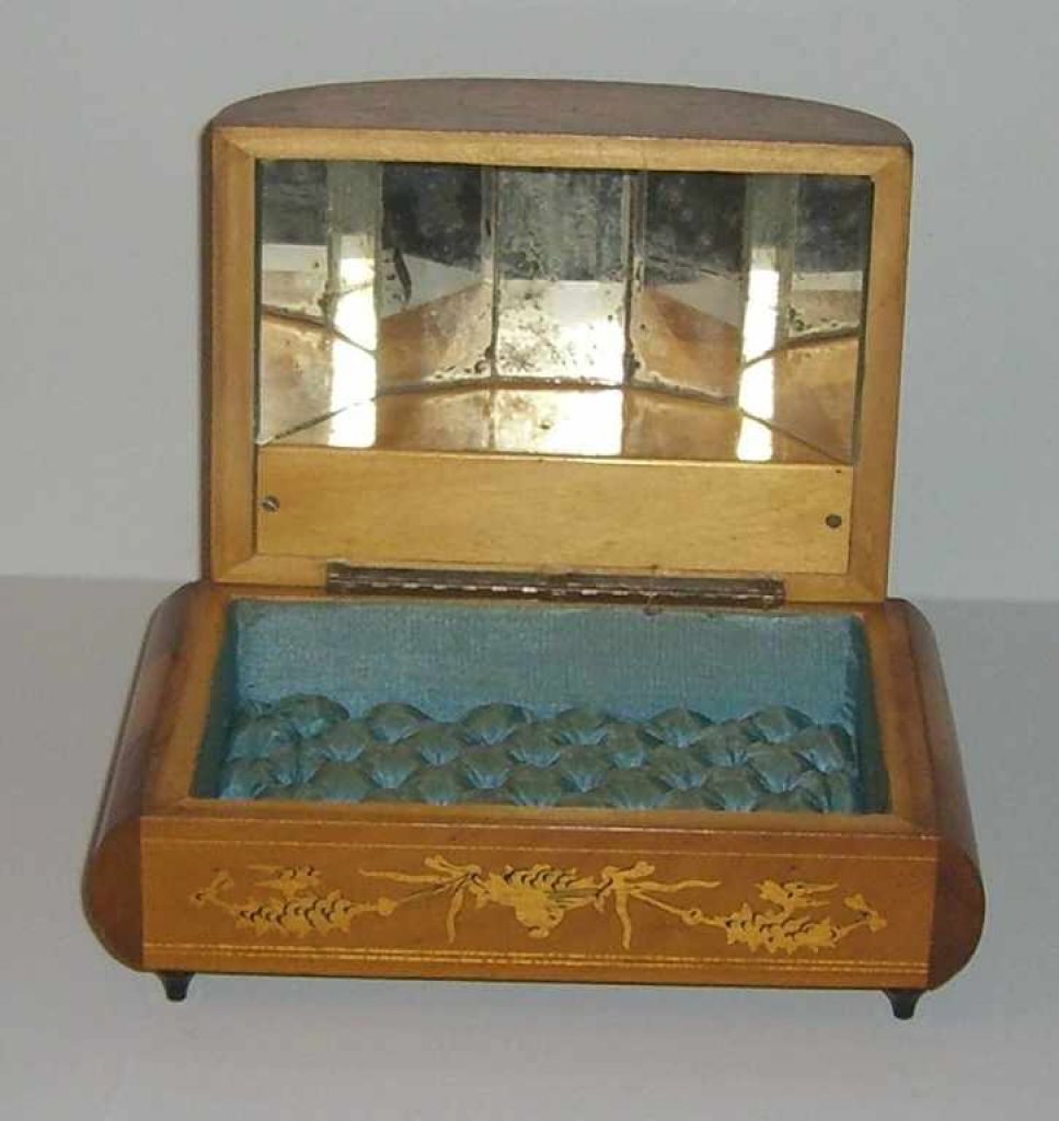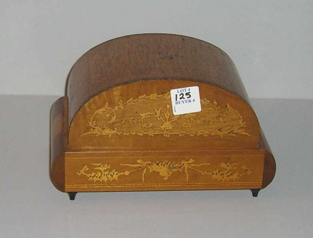Dome topped marquetry inlaid jewel casket with music box - 8 3/8" wide by 4 7/8" tall by 5 3/8" deep Dome topped marquetry inlaid jewel casket with music box - 8 3/8" wide by 4 7/8" tall by 5 3/8" deep