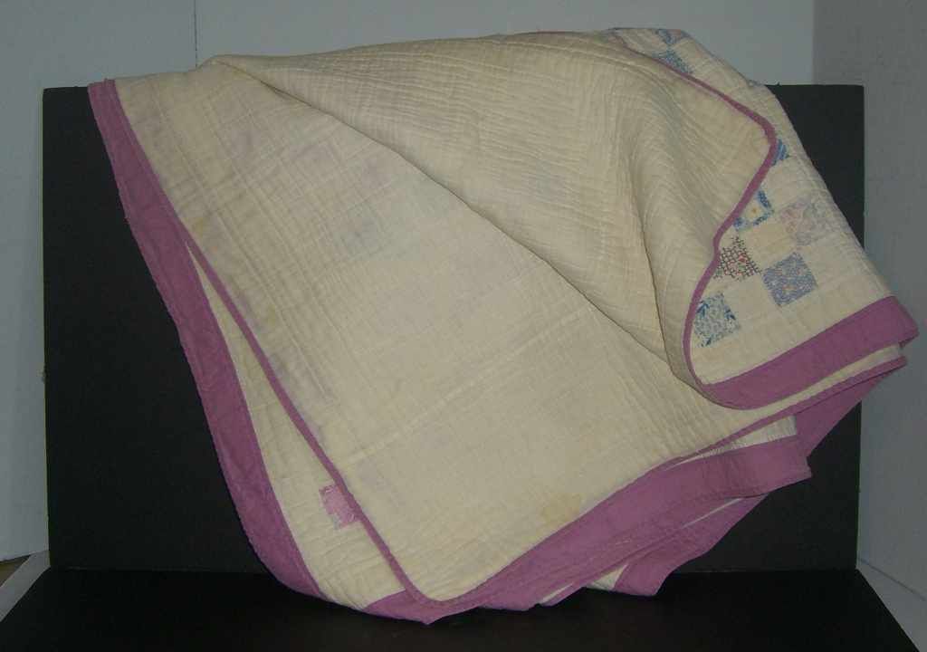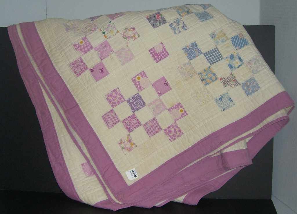Handmade block pattern quilt lavender border. Handmade block pattern quilt lavender border.